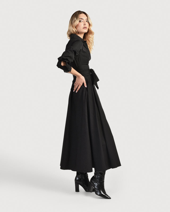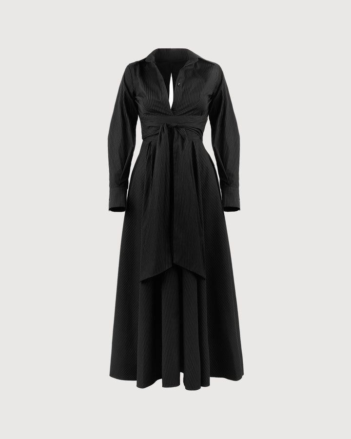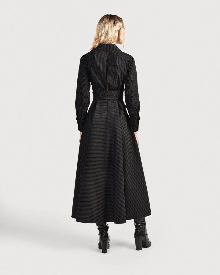 This poplin shirt dress features a fitted bodice with an integrated belt, an A-line skirt with side pockets, and a back slit from collar to waist, finished with a front button closure and long cuffed sleeves.