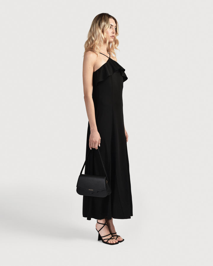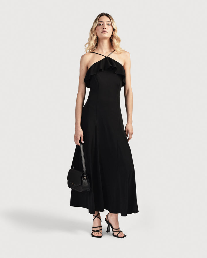 Maxi silhouette with sculpting seams, delicate straps, and a softly ruffled neckline.