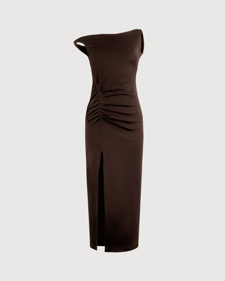 This asymmetrical midi dress features a draped neckline and waist, finished with a central leg slit and a concealed zip closure for a refined silhouette.