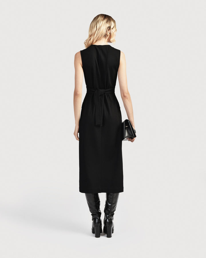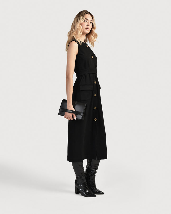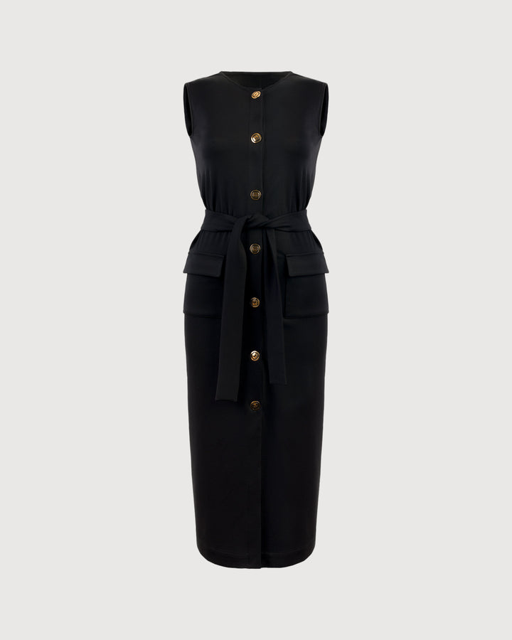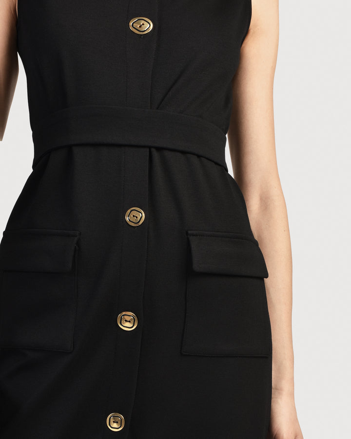 This sleeveless straight dress is detailed with a waist belt, gold button closure, and flap pockets.