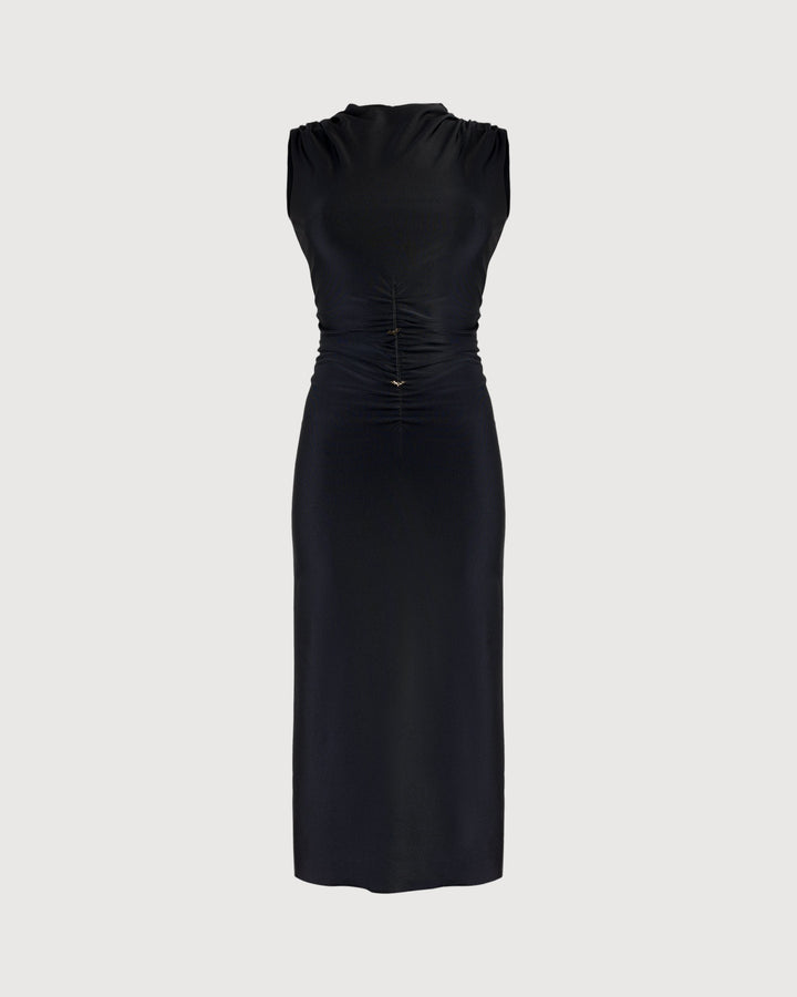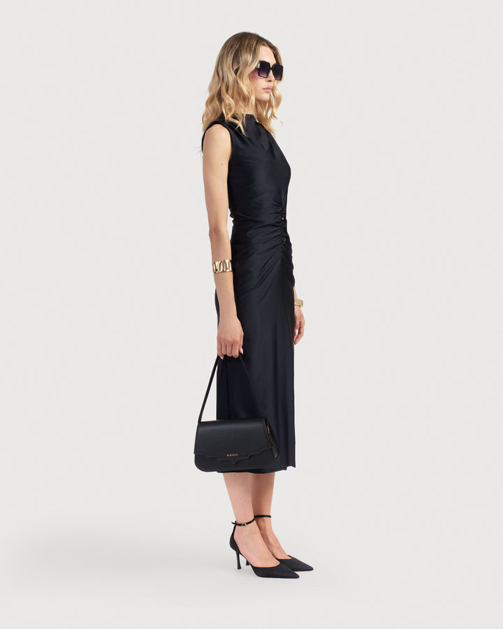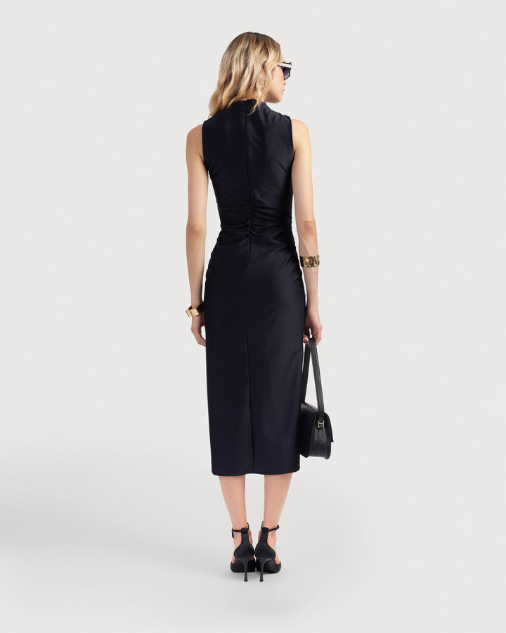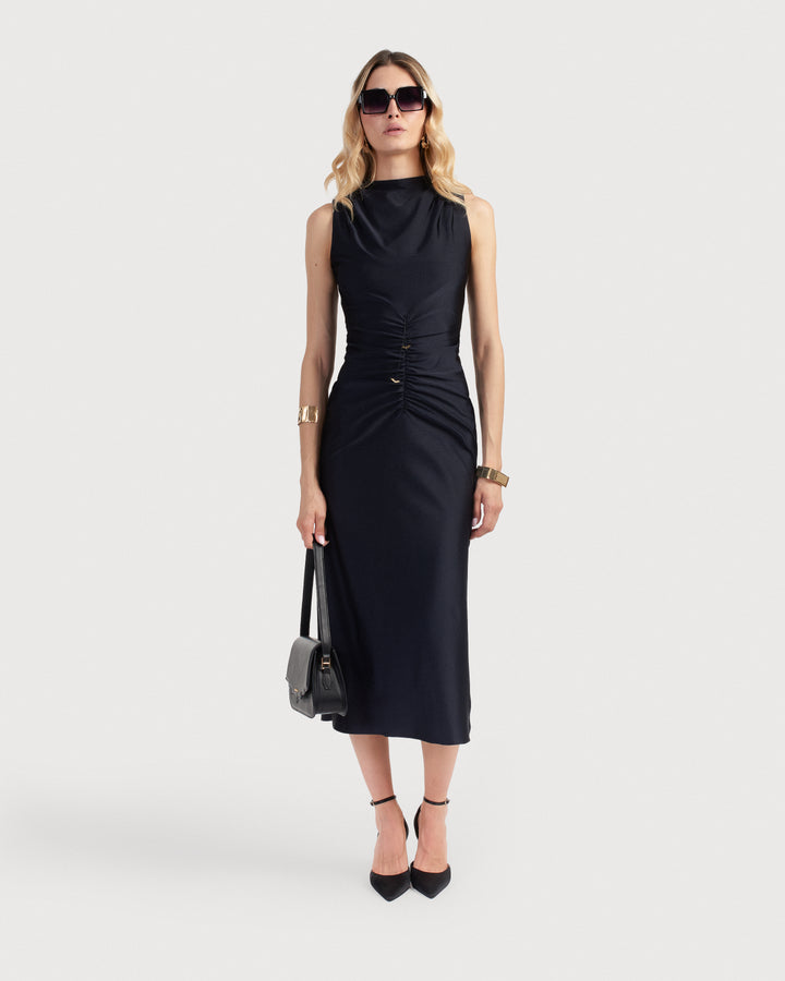 This sleeveless black midi dress features a high neckline, central ruching adorned with DIVALO’s signature golden bats, and a discreet sheen, finished with a back slit for ease of movement.