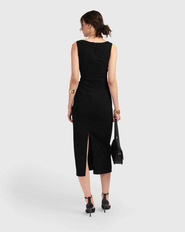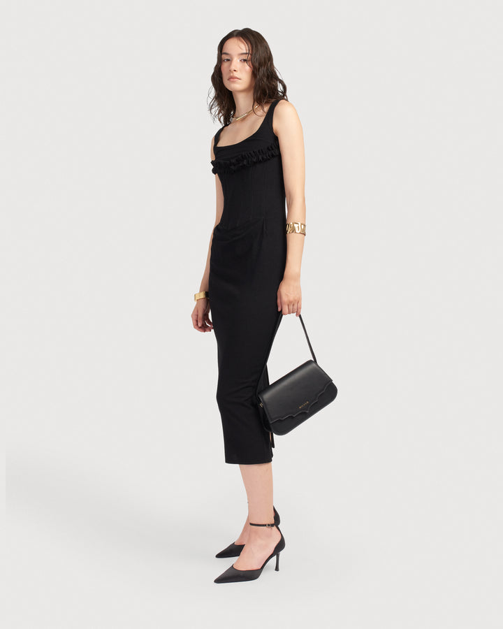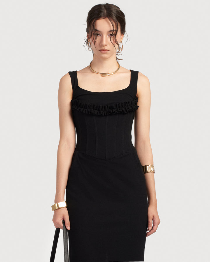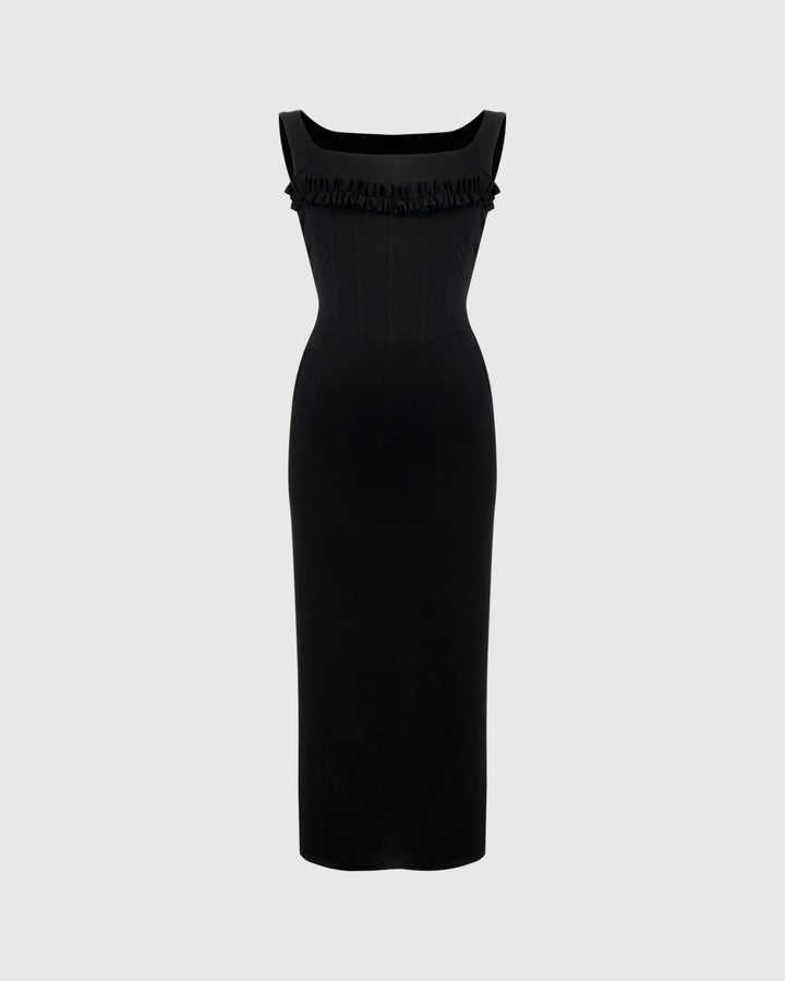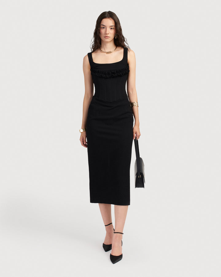 This fitted midi dress features a square neckline with ruffle trim, corset boning, and waist darts, fully lined and finished with a hidden back zip closure.
