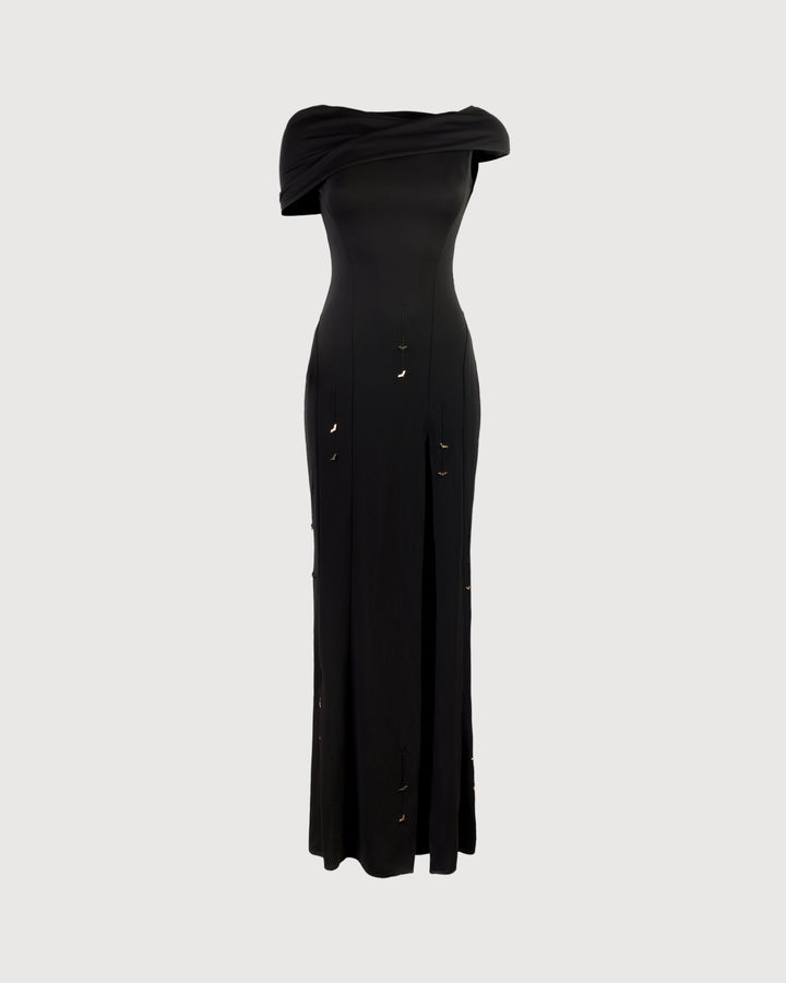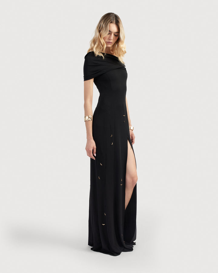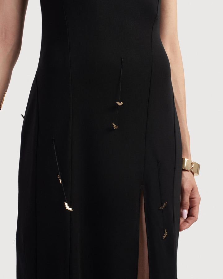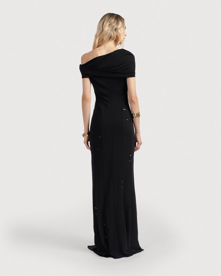 Asymmetric one-shoulder gown with sculpted draping and high slit. Detailed with golden bat appliqués that move gently with every step. Finished with a fluid train and soft, twisted neckline.