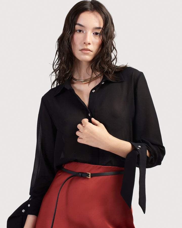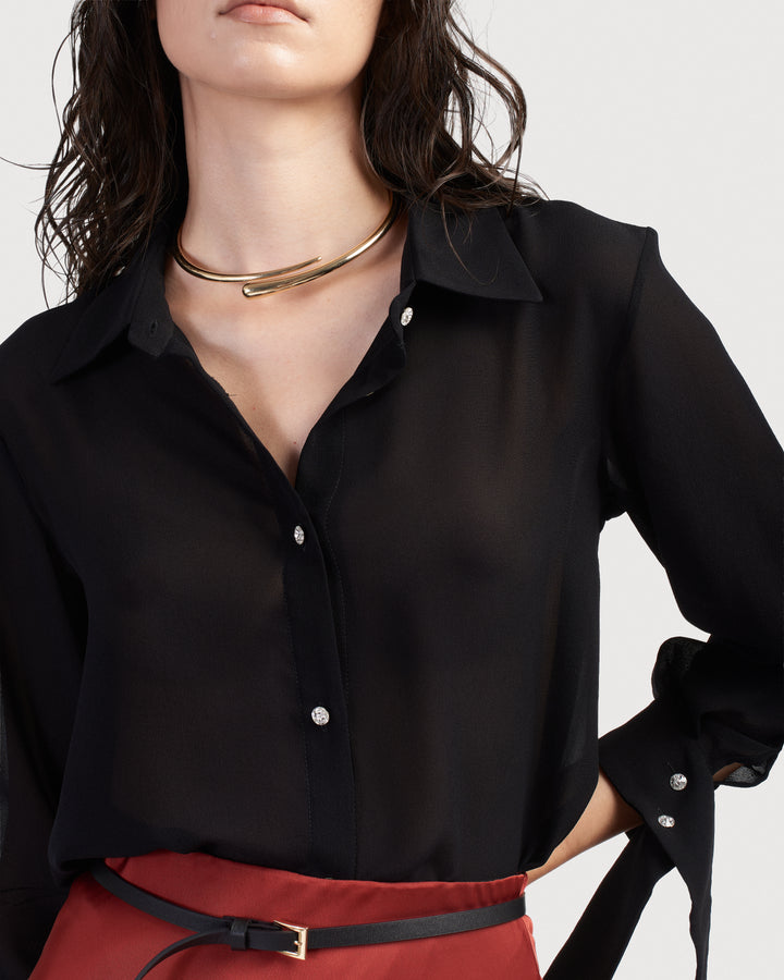 This sheer shirt is designed with a point collar, long sleeves with draped cuffs, and crystal button closures along the front and cuffs.