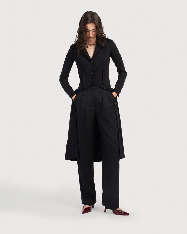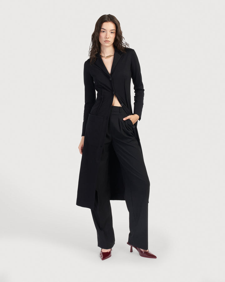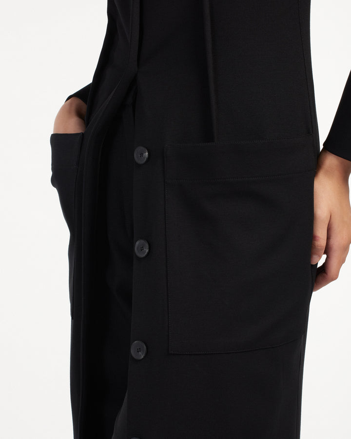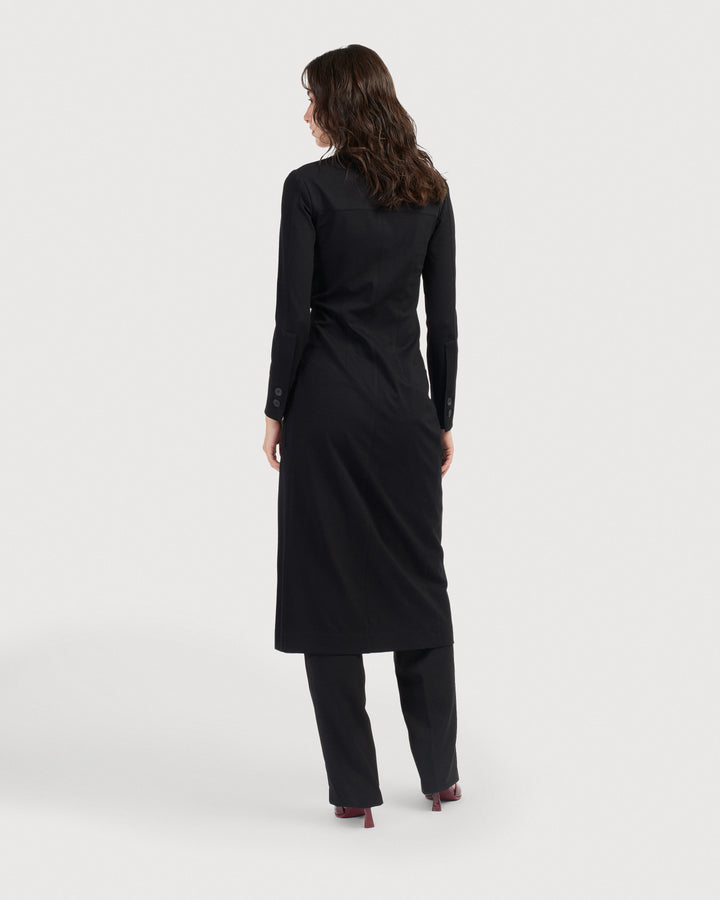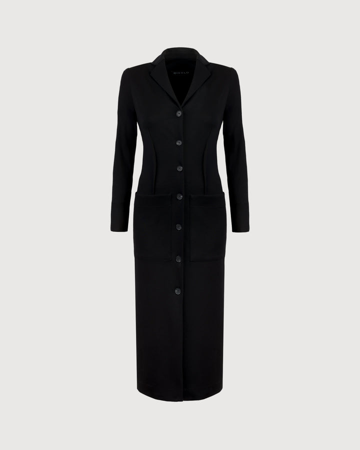 This blazer-style shirt dress features a notched lapel collar, front button closure, raised dart detailing, and patch pockets, finished with long sleeves and buttoned cuffs.